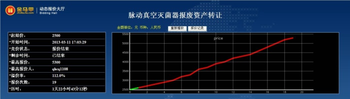 此次活动共有10位竞买人参加网络竞价,起拍价为2500.00元整,经过19次报价,最终以5300.00元整成交,项目增值率达112.0%。