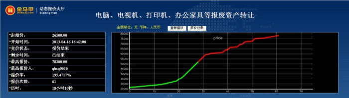 此次活动共有10位竞买人参加网络竞价,起拍价为26500.00元整,经过61次报价,最终以78300.00元整成交,项目增值率达195.47%。