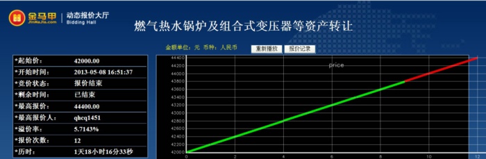 此次活动共有9位竞买人参加网络竞价,起拍价为42000.00元整,经过12次报价,最终以44400.00元整成交,项目增值率达5.00%。