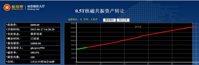 此次活动共有11位竞买人参加网络竞价,起拍价为6000.00元整,经过100次报价,最终以16800.00元整成交,项目增值率达180.00%。