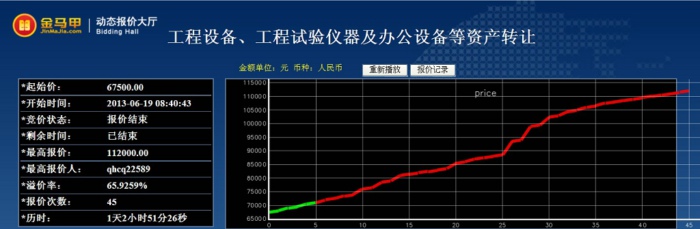 此次活动共有11位竞买人参加网络竞价,起拍价为67500.00元整,经过45次报价,最终以112000.00元整成交,项目增值率达66.00%。