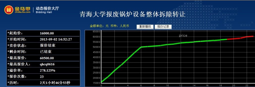 受青海省省级行政事业单位国有资产公物仓委托,青海省产权交易市场于2013年9月2日对青海大学报废锅炉设备整体拆除转让(项目编号GC13QH030223)实行公开网络竞价处置。