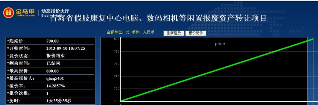 此次活动共有5位竞买人参加网络竞价,起拍价为700.00元整,经过1次报价,最终以800.00元整成交,项目增值率达14.29%。