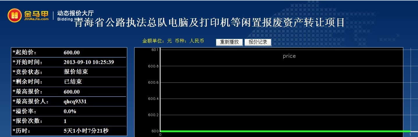 受青海省省级行政事业单位国有资产公物仓委托,青海省产权交易市场于2013年9月15日对青海省公路执法总队电脑及打印机等闲置报废资产转让项目(项目编号GC13QH030225)实行公开网络竞价处置。