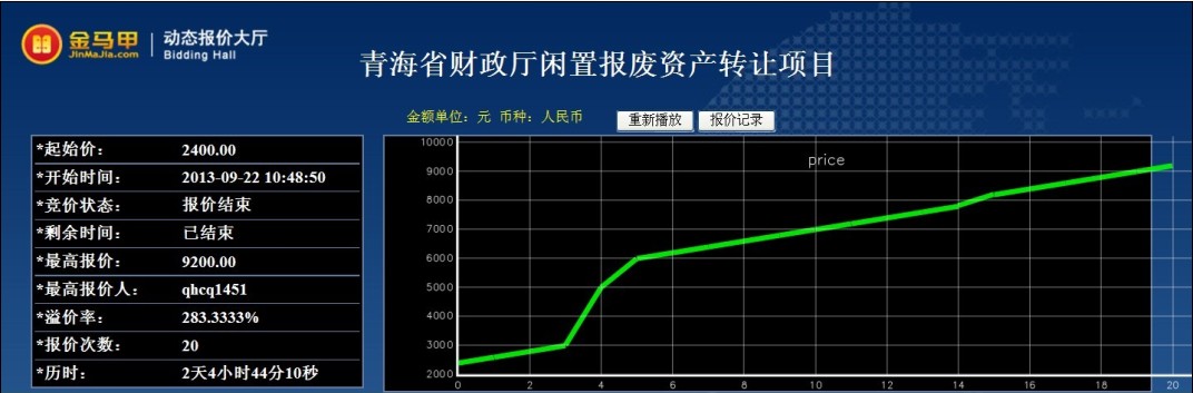 受青海省省级行政事业单位国有资产公物仓委托,青海省产权交易市场于2013年9月22日对青海省财政厅闲置报废资产转让项目(项目编号GC13QH030233)实行公开网络竞价处置。