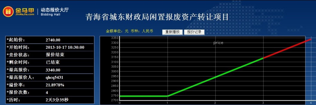 受青海省西宁市城东财政局委托,青海省产权交易市场于2013年10月19日对青海省西宁市城东区财政局报废资产转让项目(项目编号GC13QH030249)实行公开网络竞价处置。