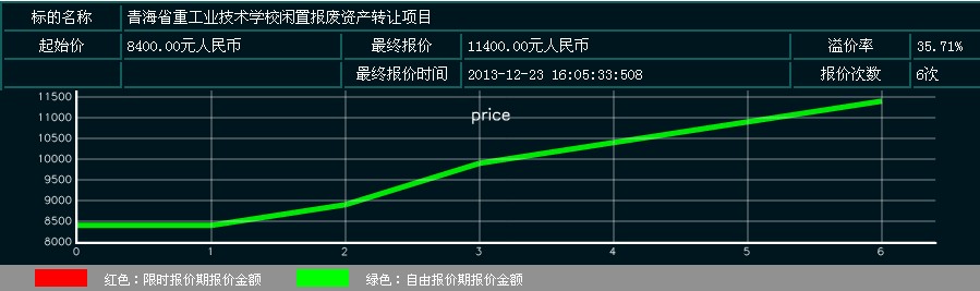 此次活动共有7位竞买人参加网络竞价,起拍价为8400.00元整,经过6次报价,最终以11400.00元整成交。
