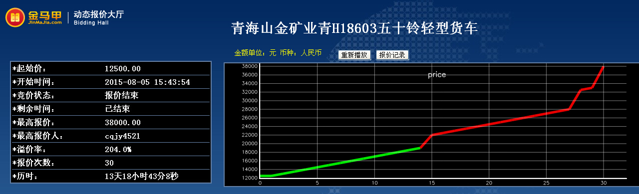青H18603五十铃轻型货车挂牌价12500元,成交价38000元,增值:25500,增值率:204%。