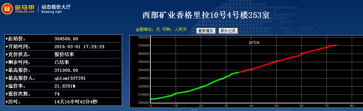 此次活动共有9位竞买人参加网络竞价,起拍价为30.45万元整,经过1次报价,最终以37.1万元整成交。