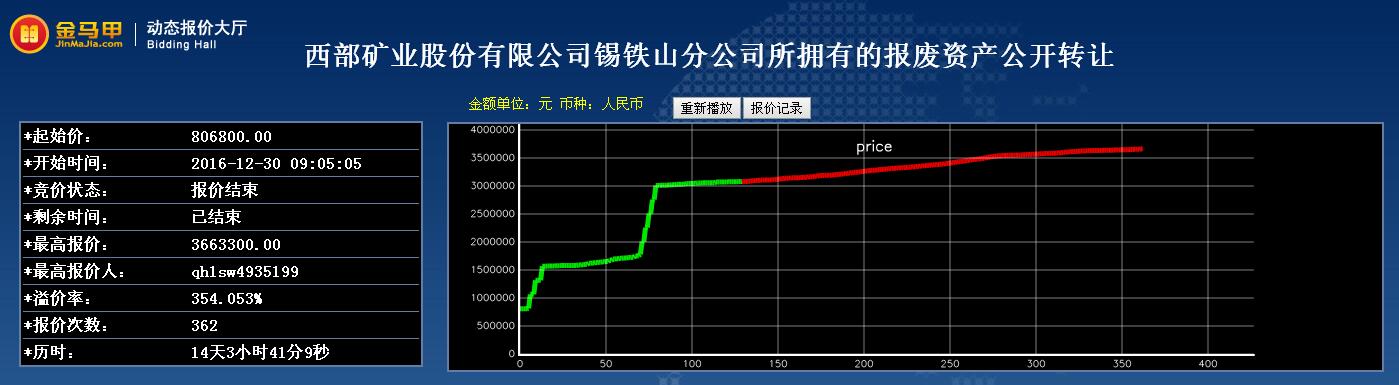 受西部矿业股份有限公司委托,青海省产权交易市场于2016年12月30日对其持有的锡铁山分公司所拥有的报废资产公开转让项目(项目编号GR2016QH1000126)实行公开网络竞价处置。