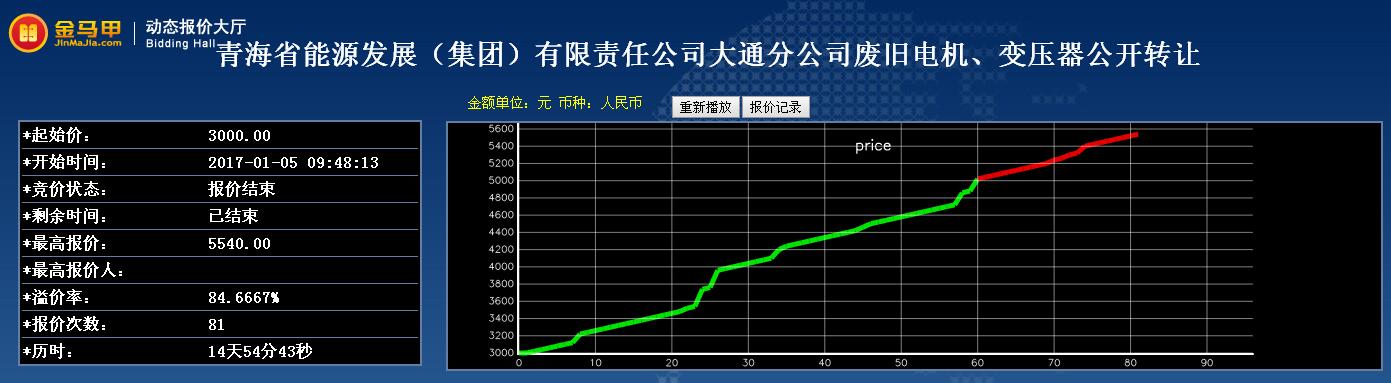 受青海省能源发展(集团)有限责任公司大通分公司委托,青海省产权交易市场于2017年1月5日对其持有的部分废旧电机、变压器3000元/吨(项目编号GZ17QH030106 )实行公开网络竞价处置。