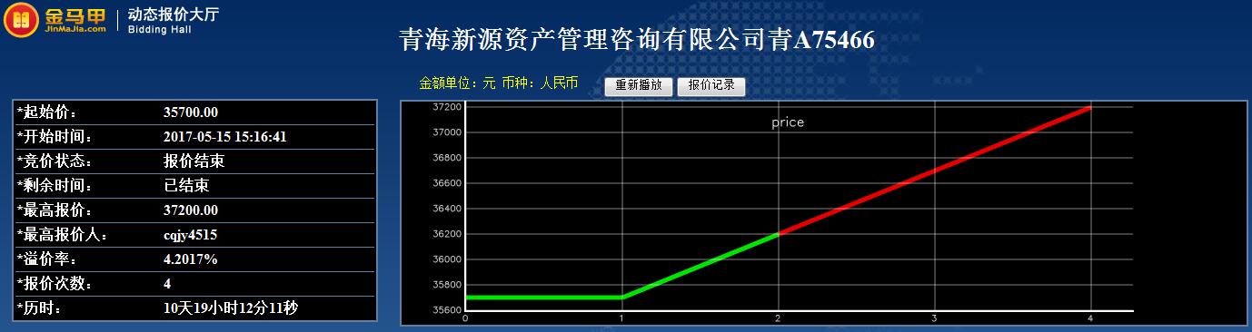 此次活动共有4位竞买人参加网络竞价,起拍价为35700元,经过4次报价,最终以37200元成交。