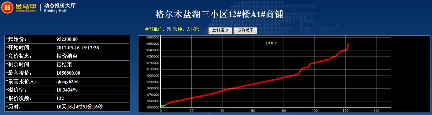 此次活动共有2位竞买人参加网络竞价,起拍价为952300元,经过122次报价,最终以1050800元成交。