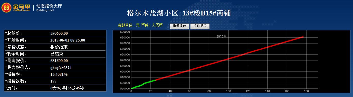 此次活动共有3位竞买人参加网络竞价,起拍价为590600元,经过177次报价,最终以681600元成交。