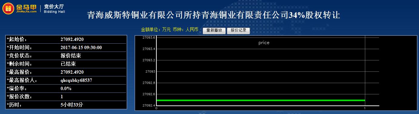 受青海威斯特铜业有限公司委托,青海省产权交易市场于2017年6月15日对其持有的青海铜业有限责任公司34%股权(项目编号GZ17QH051756)实行公开网络竞价处置。
