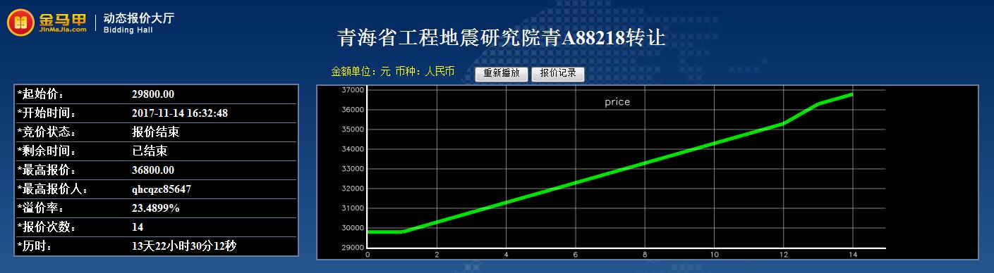 受青海省工程地震研究院委托,青海省产权交易市场于2017年11月14日对其持有的车辆青A88218(项目编号GZ17QH051106)实行公开网络竞价处置。