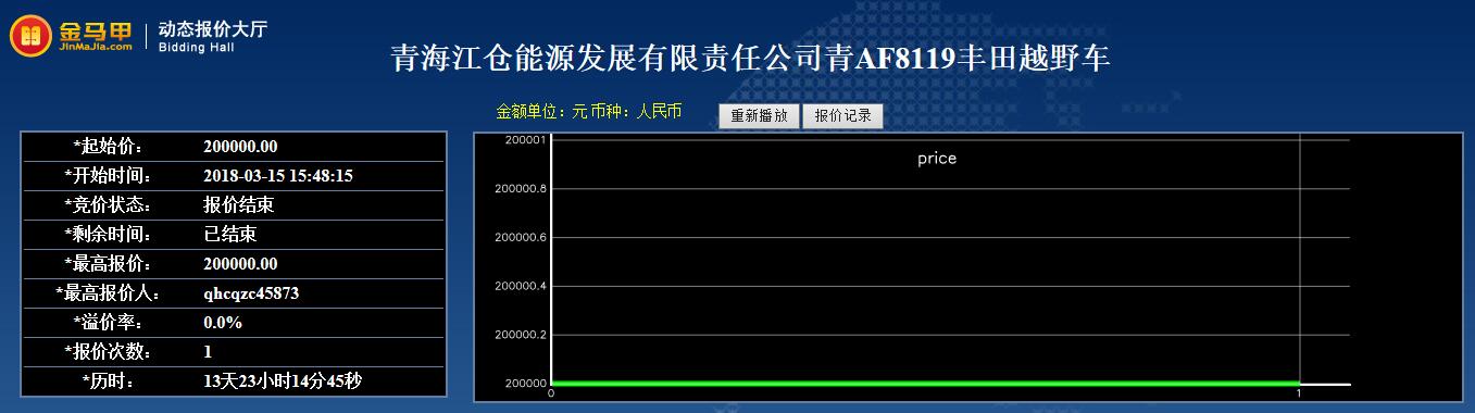 受青海江仓能源发展责任公司委托,青海省产权交易市场于2018年3月15日对其所有的青AF8119(项目编号GZ18QH050315)实行公开网络竞价处置。