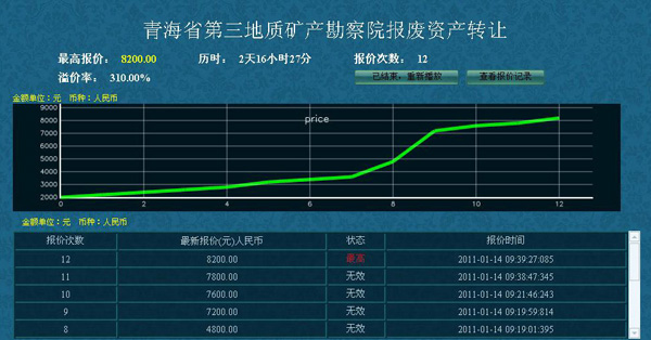 受青海省省级行政事业单位国有资产公物仓委托,青海省产权交易市场于20111 11日,对青海省第三地质矿产勘察院报废资产(项目编号:GD2011010601,场次:2011010601)实行公开网络竞价处置。此次活动共有11位竞买人参加网络竞价,起拍价为2000元,经过12次竞价,最终以8200元成交,项目增值率310.00%
