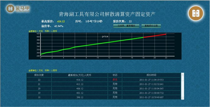 此次活动共有16位竞买人参加网络竞价,活动共接到咨询电话133个,竞价网站点击量高达500余次,报名人数46人,经审核有效报名数为16人。经过两天的网络竞价,总评估价1012.02万元的四个标的资产,最终,以1227.02万元成交,实现增值215万元,增值率为21.25%。其中标的一固定资产,以291.12万元起价,经过22次报价,最终以416.12万元成交,增值125万元,增值率为42.94%。