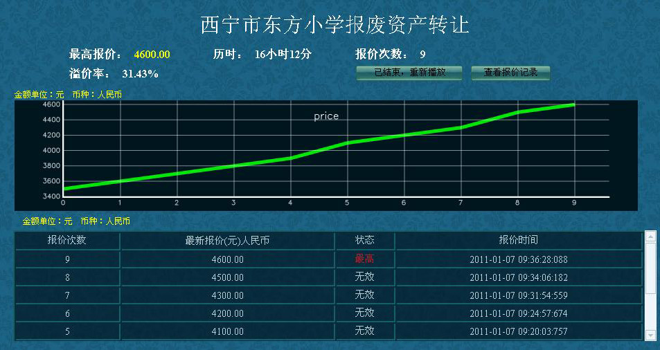 此次活动共有6位竞买人参加网络竞价,起始价为3500元,经过9次竞价,最终以4600元成交,项目增值率31.43%。