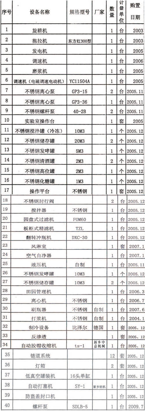 本次转让的制酒研发设备为2005年购置的果酒研发设备。由于该单位研发项目停滞,现有的40项设备于2008年7月停用至今,全套设备经维护后可以再利用。