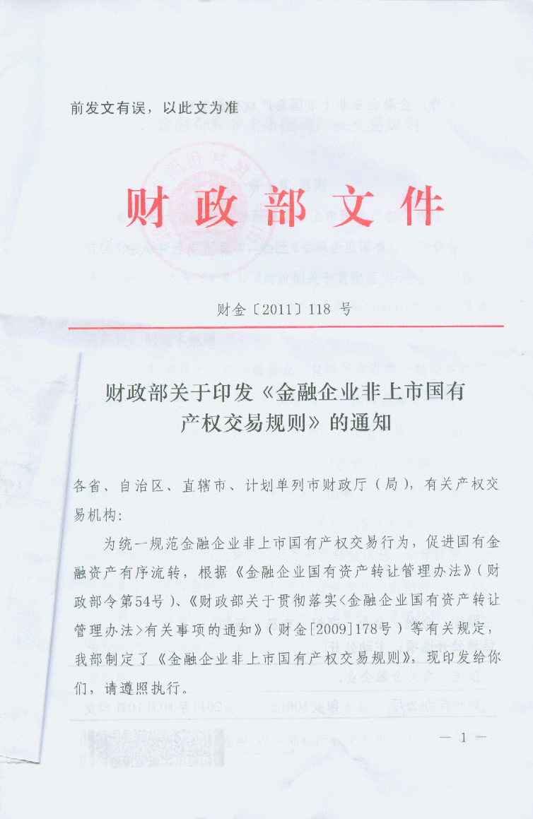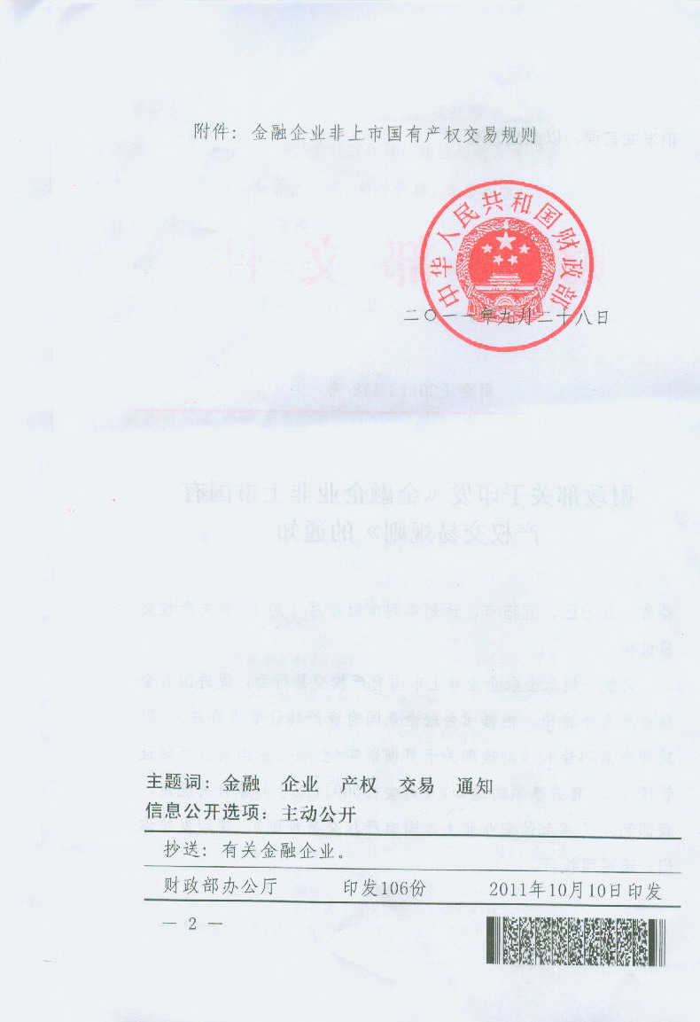 财政部关于印发《金融企业非上市国有产权交易规则》的通知