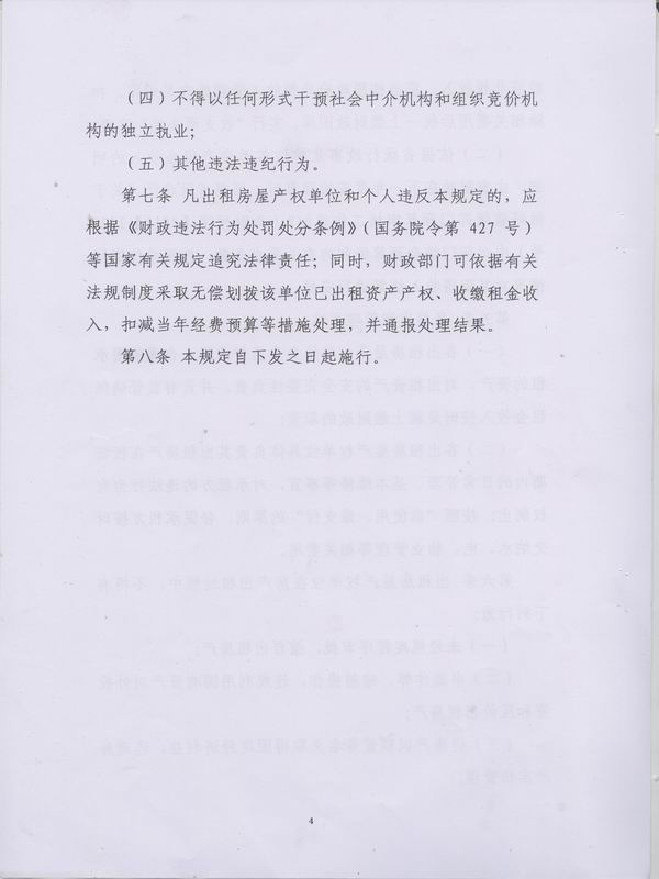 第七条 凡出租房屋产权单位和个人违反本规定,应根据《财政违法行为处罚处分条例》(国务院令第427号)等国家有关规定追究法律责任:同时财政部门可依据有关法规制度采取无偿划拨该单位已出租资产产权、收缴租金收入,扣减当年经费预算等措施处理,并通报处理结果。