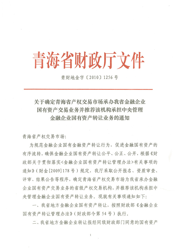 关于确定青海省产权交易市场承办我省金融企业国有资产交易业务并推荐该机构承担中央管理金融企业国有资产转让业务的通知