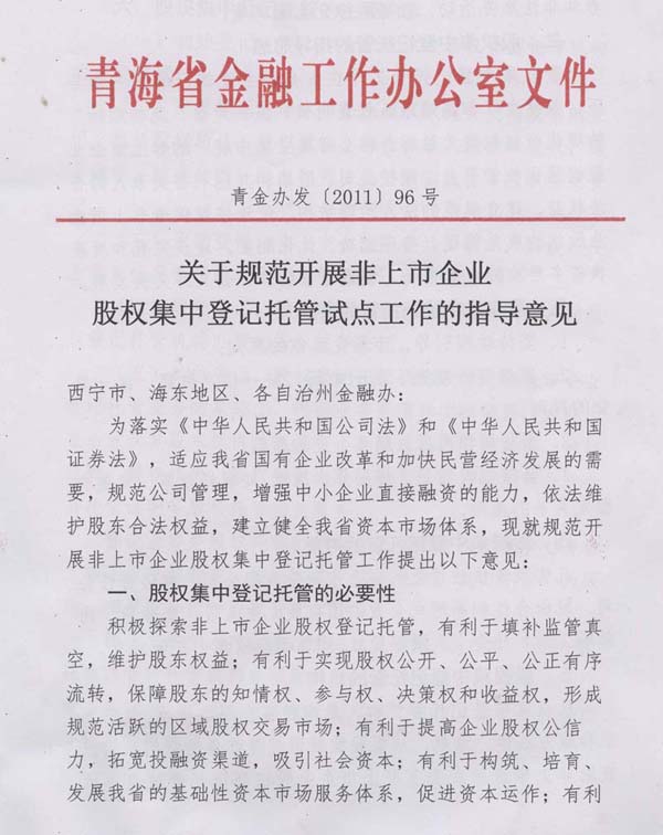 为全省非上市企业提供股权集中托管和股权质押融资服务