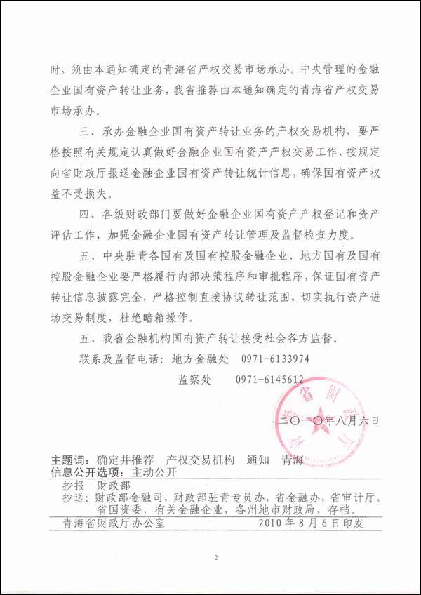 省财政厅:选定市场承办青海省金融企业国有资产交易业务