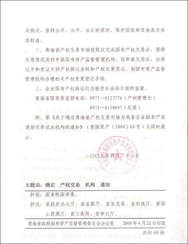 2009年4月,省国资委下发了《青海省政府国有资产监督管理委员会关于确定青海省产权交易市场为我省企业国有产权交易进场交易机构的通知》(青国资产〔2009〕40号),我市场通过3年的试点并考核,正式具有了从事企业国有产权交易的资格。