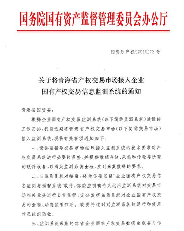 2010年3月5日,经国务院国资委审核批准,我市场成为青海省省级产权交易平台,负责本省产权交易和信息发布,并将我市场网站接入国务院国资委“企业国有产权交易信息监测网”,因此我市场也具有了从事全国企业国有产权交易的资格(国资厅产权〔2010〕72号)。