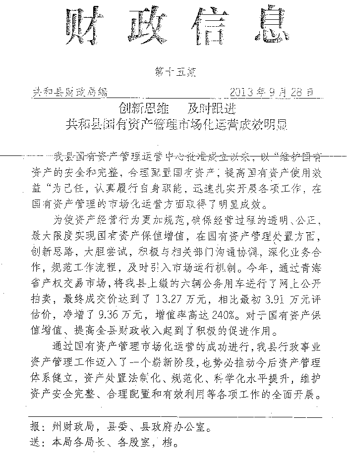 为使资产经营行为更加规范,确保经营过程的透明、公正,最大限度实现国有资产保值增值,在国有资产管理处置方面, 创新思路,大胆尝试,积极与相关部门沟通协调,深化业务合 作,规范工作流程,及时引入市场运行机制。今年,通过青海 省产杈交易市场,将我县上缴的六辆公务用车进行了网上公开拍卖,最终成交价达到了 13.27万元,相比最初3.91万元评 估价,净增了 9.36万元,增值率高达240%对于国有资产保值增值、提高全县财政收入起到了积极的促进作用。