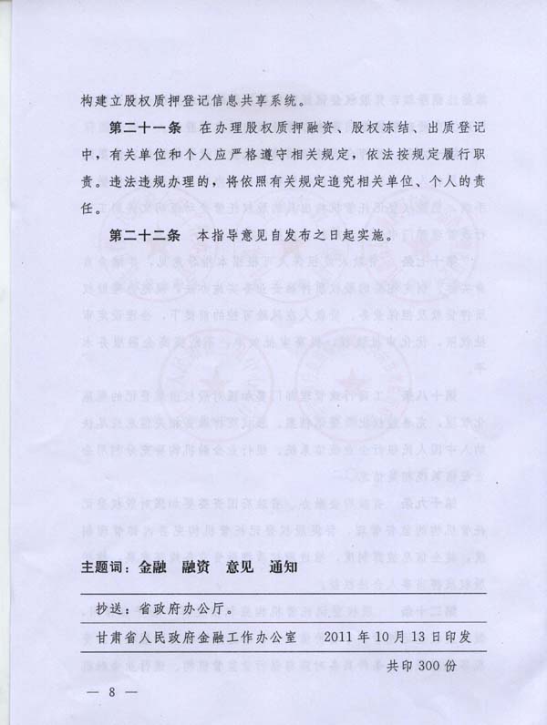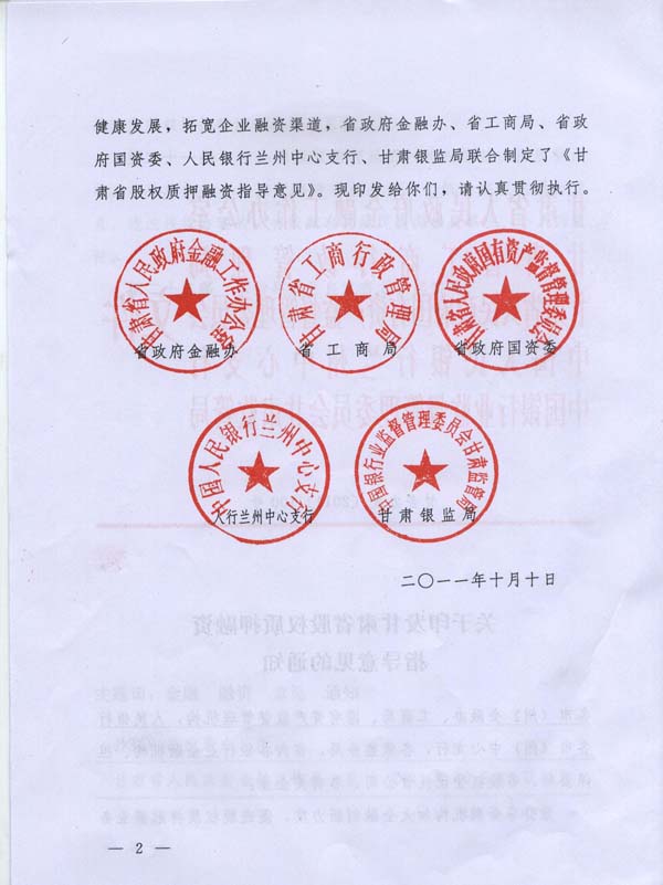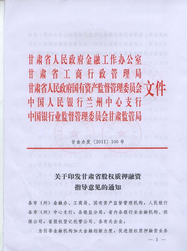 甘肃省五部门联合出台《关于印发甘肃省股权质押融资指导意见的通知》