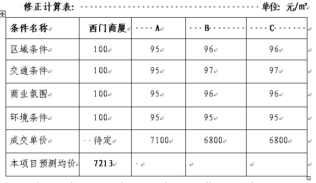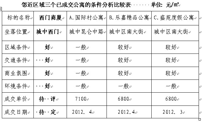 根据对西门商厦最符合市场预期的设计定位:酒店式公寓。对该项目的交易价值分析拟采用资产评估办法中的市场比较法。即:选择同一区域内近期已销售完毕并投入营业的同一类型酒店式公寓案例与该项目按区域条件、交通条件、商业氛围、环境条件予以比较修正的方法,计算出该项目的交易价值,并以此作为本项目的平均交易参考价。