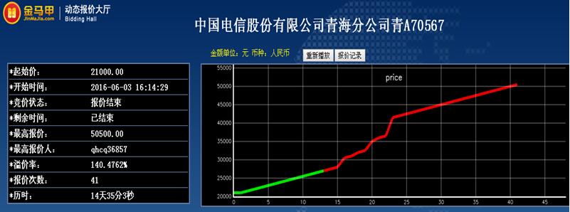 受中国电信股份有限公司青海分公司委托,青海省产权交易市场于2016年6月3日对其持有的青A70567转让项目(项目编号GZ16QH050603)实行公开网络竞价处置。