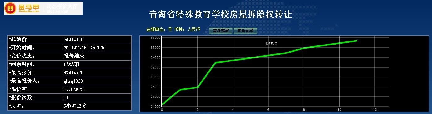 此次活动,共接到咨询电话70余个,该项目公告市场网站点击量达120余次,报名人数14人,经过严格的资质审核筛选,最终有效报名数为10人。该项目起始价为74414.00元,经过11次报价,最终以87414.00元成交,项目增值率17.47%。