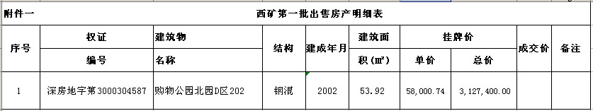 受西部矿业集团有限公司委托,青海省产权交易市场对该公司所属深圳市购物公园北园D区202商铺公开转让,建筑面积为53.92平方米,挂牌价312.74万元。