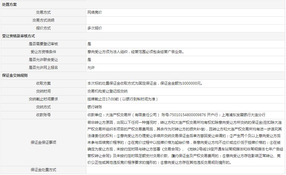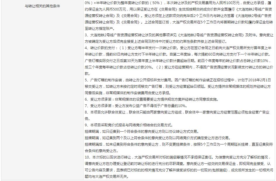 (2017第169号)大连地铁2号线19座开通车站常规媒体和非常规媒体七年广告经营权转让