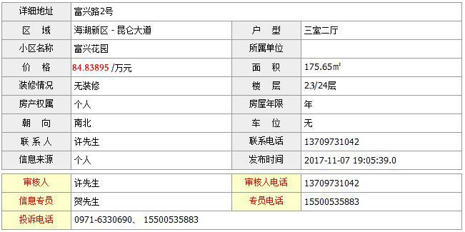 受某个人委托,青海省产权交易市场对其所有的西宁市海湖新区富兴花园(6号楼6—1233室)1套住房公开转让。挂牌价:84.83895万元(面积175.65㎡)。