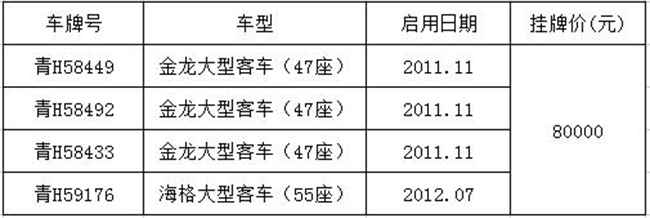 依据《中华人民共和国企业国有资产法》《企业国有资产交易监督管理办法》(国务院国资委、财政部第32号令)《青海省企业国有资产交易监督管理办法》(青国资产〔2017〕339号),受格尔木盐湖交通运输有限责任公司委托,青海省产权交易市场对该单位所拥有的四台通勤车公开整体转让,挂牌总价80000元。