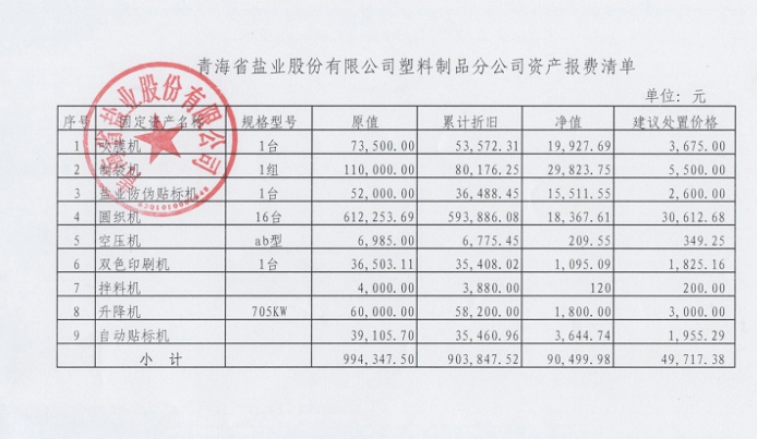 青海省产权交易市场受青海省盐业股份有限公司委托,对其下属企业——塑料制品分公司拥有的吹膜机、制袋机、空压机等报废资产公开转让, 挂牌价49717.38元。