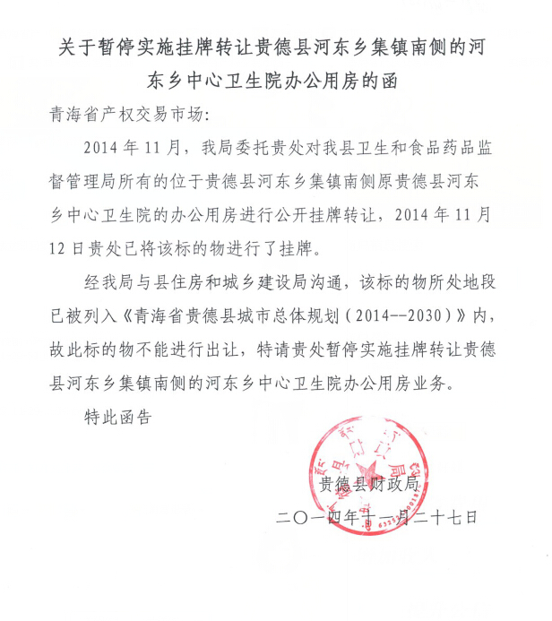 青海省产权交易市场受贵德县财政局的委托,对贵德县卫生和食品药品监督管理局所有的位于贵德县河东乡集镇南侧原贵德县河东乡中心卫生院的办公用房公开转让,挂牌价格41.3036万元。