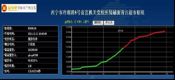 11月23日10时40分,该项目最后一个商铺(5号标的物)网络竞价实现完美收宫,至此,省级行政事业单位房屋租赁的首个项目—省直机关党校项目在青海省产权交易市场的精心操作下,取得了成功。市场将认真总结此次房屋出租网络竞价过程中的经验,在健全制度、完善方案、夯实基础、练好内功方面实现更精细化的管理,为大量的省级行政事业单位的房屋出租实现网络化招租打下一个坚实的基础。