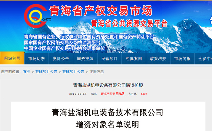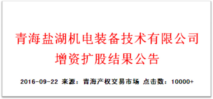 ——青海省产权交易市场助力青海盐湖机电增资7200万元