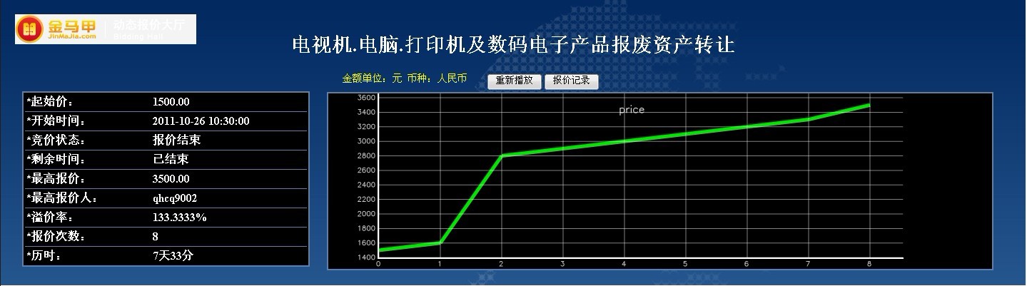 此次活动共有10位竞买人参加网络竞价,起拍价为1500.00元,经过8次报价,最终以3500.00元成交,项目增值率133%