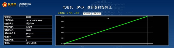 此次活动共有5位竞买人参加网络竞价,起拍价为800.00元整,经过1次报价,最终以900.00元整成交,项目增值率达12.0%。