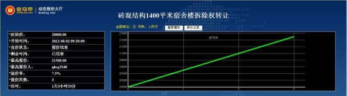 此次活动共有2位竞买人参加网络竞价,起拍价为20000.00元整,经过3次报价,最终以21500.00元整成交,项目增值率达8.0%。