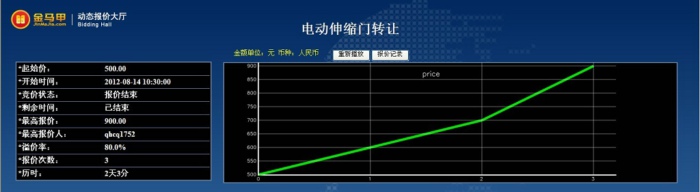 此次活动共有6位竞买人参加网络竞价,起拍价为500.00元整,经过3次报价,最终以900.00元整成交,项目增值率达80.0%。