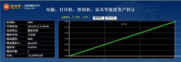 此次活动共有10位竞买人参加网络竞价,起拍价为6500.00元整,经过3次报价,最终以6800.00元整成交,项目增值率达5.00%。
